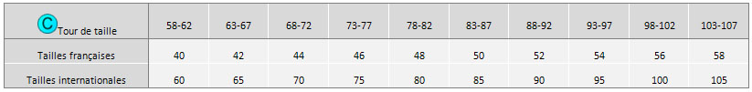 Mesurez votre tour de taille (C) et vous obtiendrez la taille à commander, en cm.