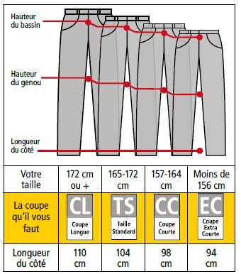 Afin de choisir le pantalon qu'il vous faut, prenez un de vos pantalons et mesurez la longueur du coté de celui-ci, puis reportez-vous au tableau ci-contre. Cela vous permettra de déterminer la coupe qu'il vous faut. Les indications de longueur ci-contre se réfèrent à la taille 44. Additionnez ou soustrayez 1 cm par taille pour obtenir la longueur de l'article désiré.