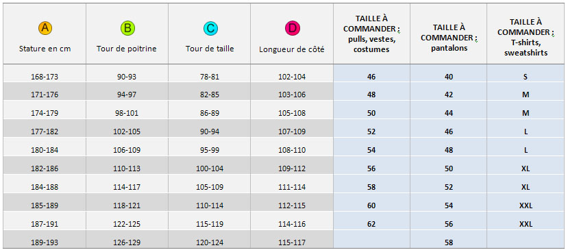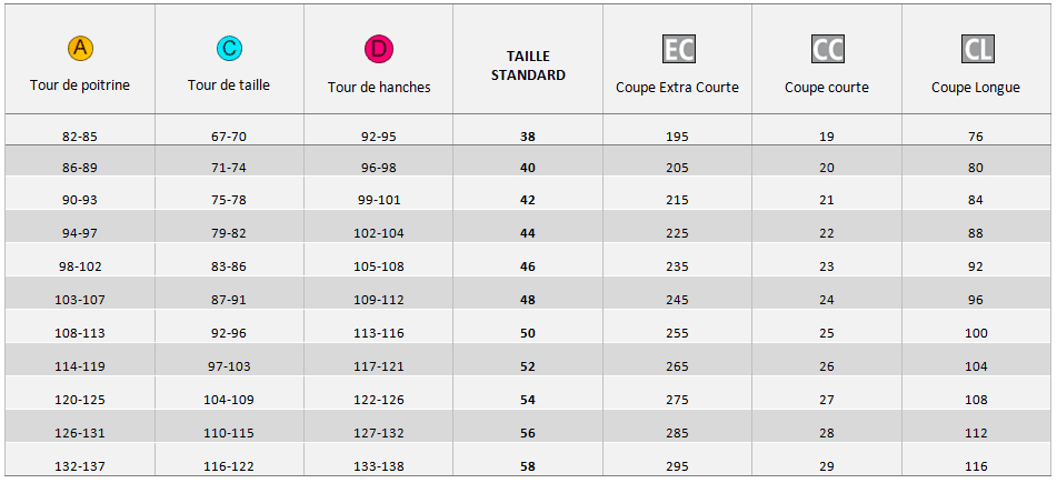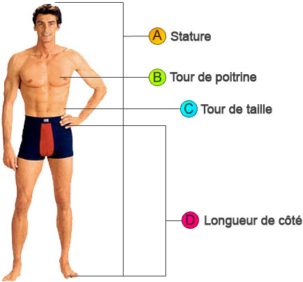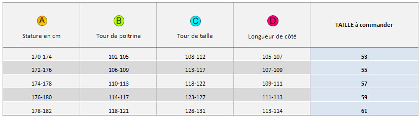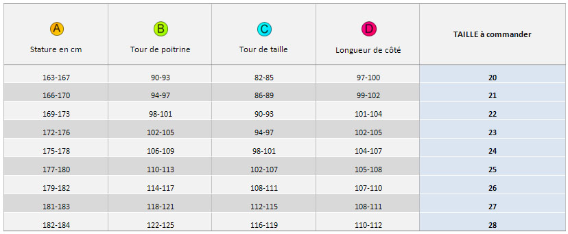 Pour cela, commencez par mesurer sa stature (A), son tour de poitrine (B), son tour de taille (C) et son tour de hanche (D). Puis, comparez les chiffres du tableau ci-dessous avec les mesures obtenues et choisissez la taille à commander correspondante.