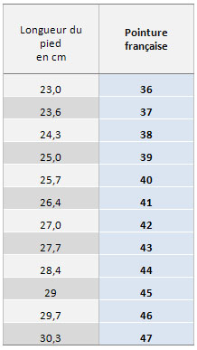 Ensuite, mesurez la longueur entre le talon et le gros orteil, et reportez-vous au tableau ci-dessous.