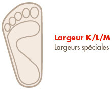 Les largeurs F et G sont faites pour les pieds standards, les largeurs H et J pour les pieds forts, et les largeurs K, L et M sont des largeurs spécialement conçues pour les pieds les plus forts.